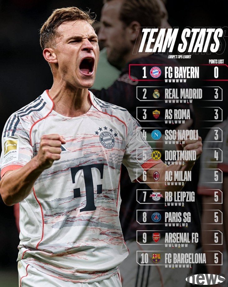 Bayern officially released the list of the five major league teams this season, with Bayern being the only team that won all the wins, and Real Madrid and other three teams lost 3 points. The following is the specific list: